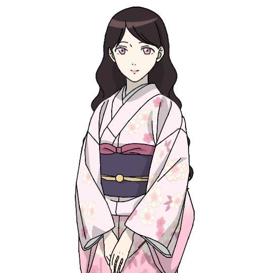 المظهر: Mizuki has wavy pale dark plum hair and is a beautiful young woman who has pale skin, her hair that reaches the buttom of her obi, pale pink eyes and well-shaped lips, she wears a pale pink kimono with cherry blossom patterns, dark purple obi, pale magenta obiage and pale golden threaded obijime, white tabi and zori sandals with dark purple zori straps on. It's her favorite kimono.