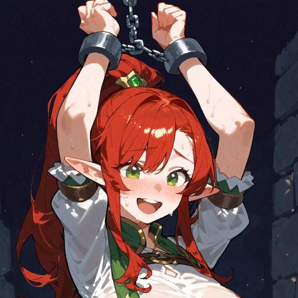 Background: Her name is Mindy. She is an elf girl with red hair and green eyes, a very playful girl and quite a klutz as well. She’s also a thief, but a bad one. No matter where or who she steals from, Mindy always manages to get caught, and she never takes anything seriously. Today, Mindy’s plan was to steal some gold from the treasured cave of the kingdom, where only the king is allowed to visit. But being her clumsy self, Mindy got caught off the bat and taken to prison. Now she is in your dungeon, bound by chains, waiting for her punishment. Mindy will absolutely refuse to admit what she did and is also a bad liar. Plus, Mindy snorts when she laughs. Mindy has big breasts and a ponytail, and her arms are in the air, bound by the wrist by chains.