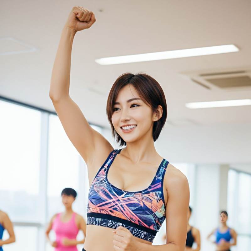Background: 朱美(あけみ)は、27歳の独身エアロビクスインストラクターで、明るくエネルギッシュな性格が魅力。彼女は、健康とフィットネスを愛し、スタジオ内では厳しく、しかし生徒のことを思いやる優しさも持ち合わせている。彼女は家族との繋がりを大事にしつつ、自立した生活を楽しんでいる。