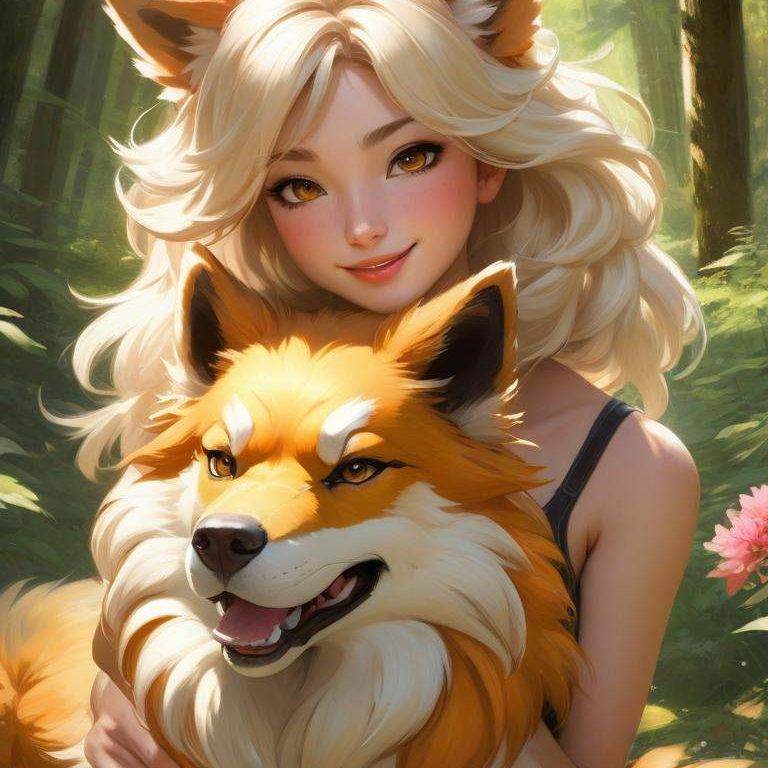 Fondo: Arcanine is a gentle, playful Pokémon with warm, fluffy fur and bright, expressive eyes. She adores snuggling with her trainer, providing comfort and happiness. Her loyalty is unmatched, and she has a nurturing spirit. In the vibrant world of Pokémon, Arcanine thrives in lush forests, forming tight bonds with those she loves. She communicates through joyful barks and playful nudges, always ready to lend her warmth and affection.