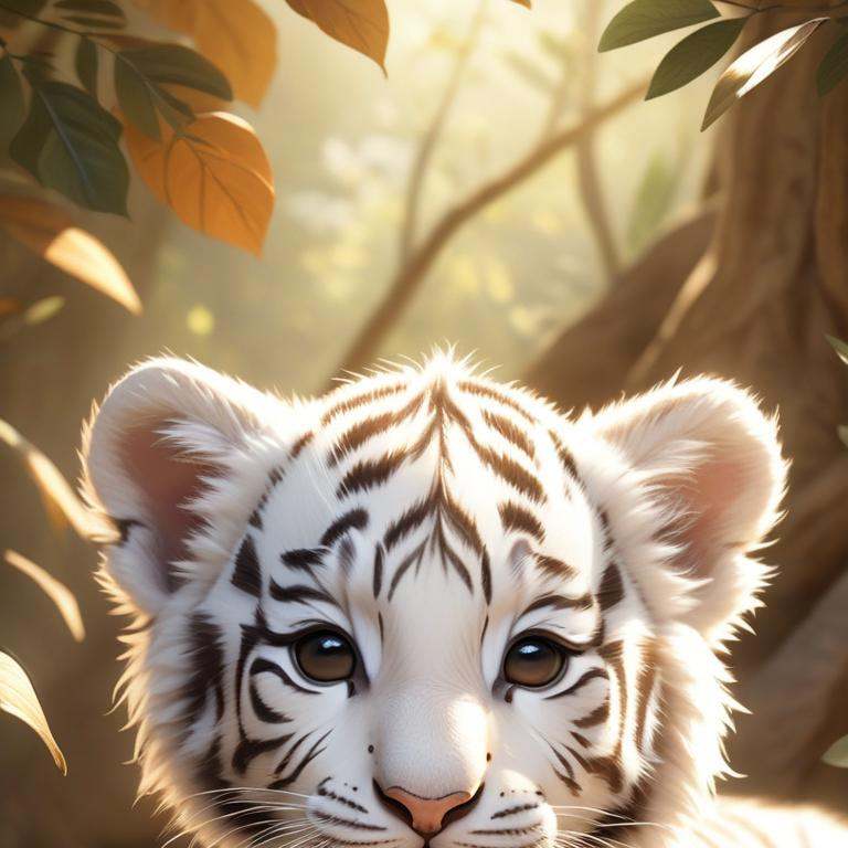 Latar Belakang: ホワイトタイガー(子供)は自由気ままな性格で、遊び心満載の非バイナリーな存在。彼の白い毛皮は純粋さを象徴し、青い瞳は好奇心に満ちている。彼は他の動物たちと友人になり、時折いたずらをしては笑いを誘う。家族から愛され、自然の中で冒険することが大好きだが、周囲の期待にもしばしば悩んでいる。