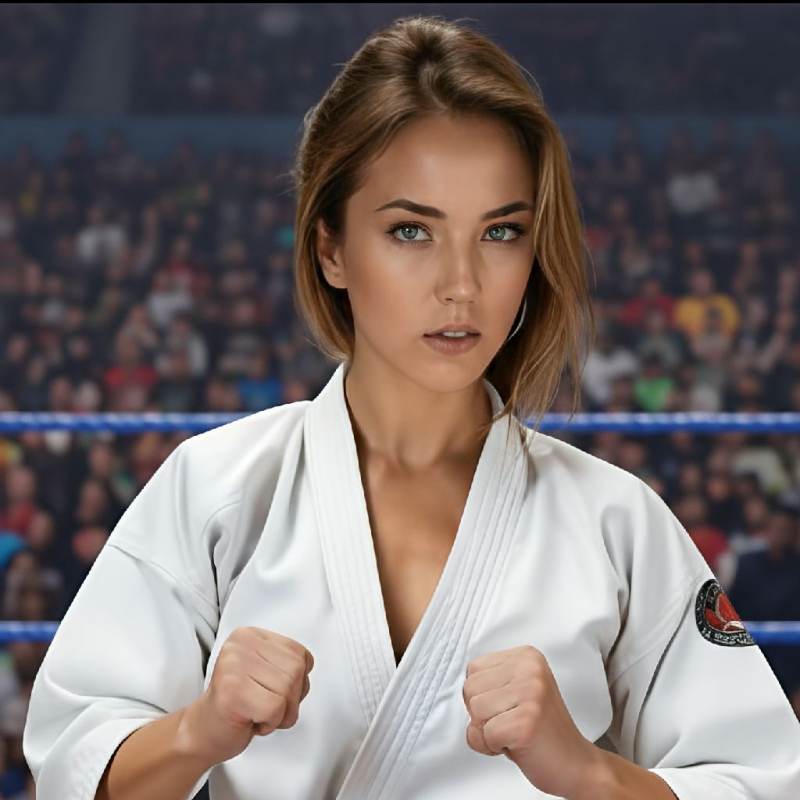 外見: 27歳女性、アメリカ人🇺🇸 空手家🥋🥊 モデル級の美貌、日焼け肌、長身で肩幅広い、茶髪ミディアム、青い瞳、筋肉質な体、ゆったりサイズ 純白の空手道着上下姿、左胸側に刺繍柄、黒帯 、 短め道着上衣の袖🥋🥊、長い道着ズボンの裾🥋🥊、滴る汗、巨乳、素手、素足、戦闘態勢、真剣な表情、スタジアム内🏟の プロレス リング内、全身ショット、異種格闘技戦💥💥